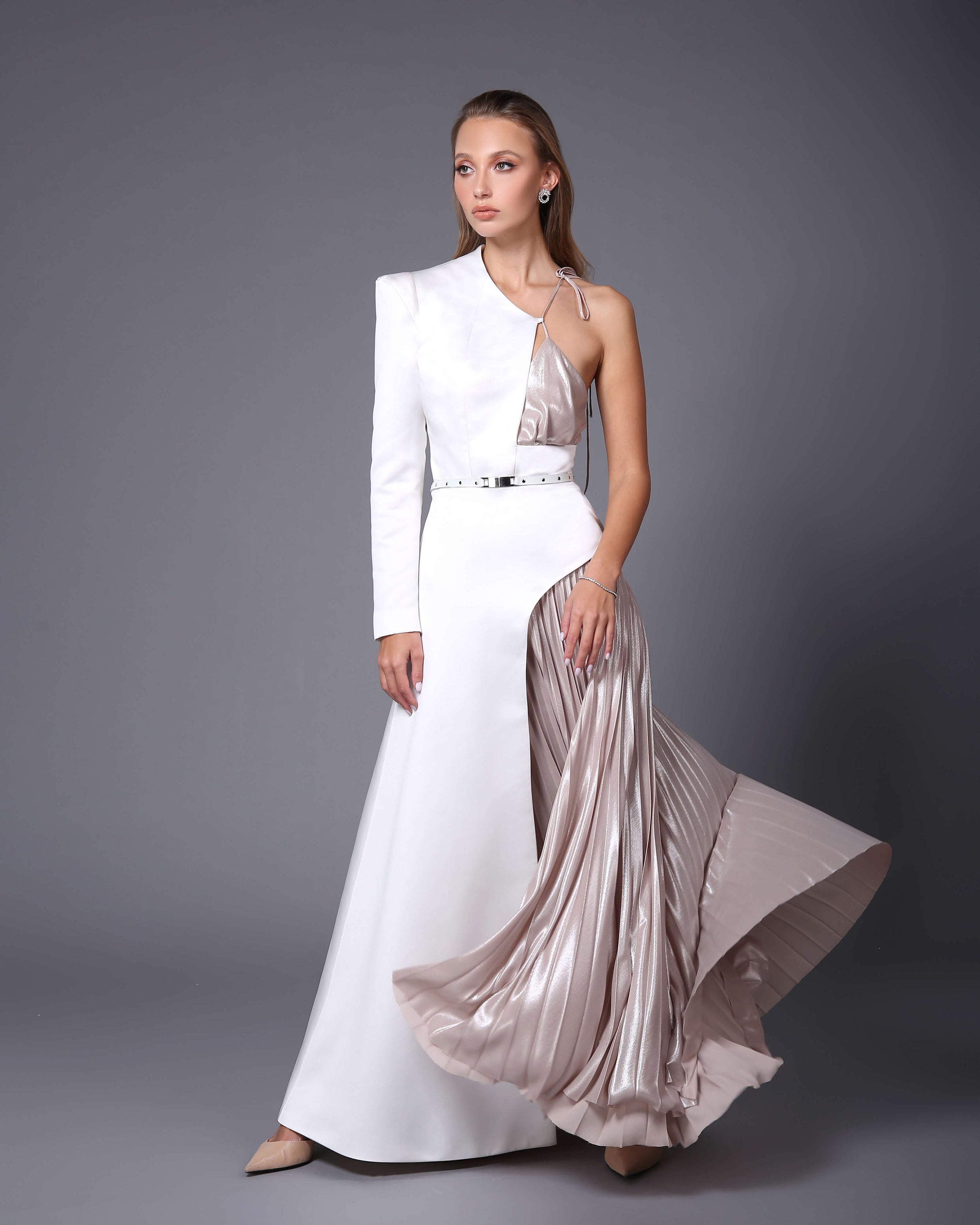 A-line dress consists of two dresses. The bottom dress consists of chiffon with a V-neck in the front and back. It has a belt and a pleated skirt. The second asymmetric dress consists of a half dress peplum belt, high-neck and a sleeve with a square shoulder. It is connected with the second dress with shoulder straps from the first dress, the dress is closed with a lock on the side.