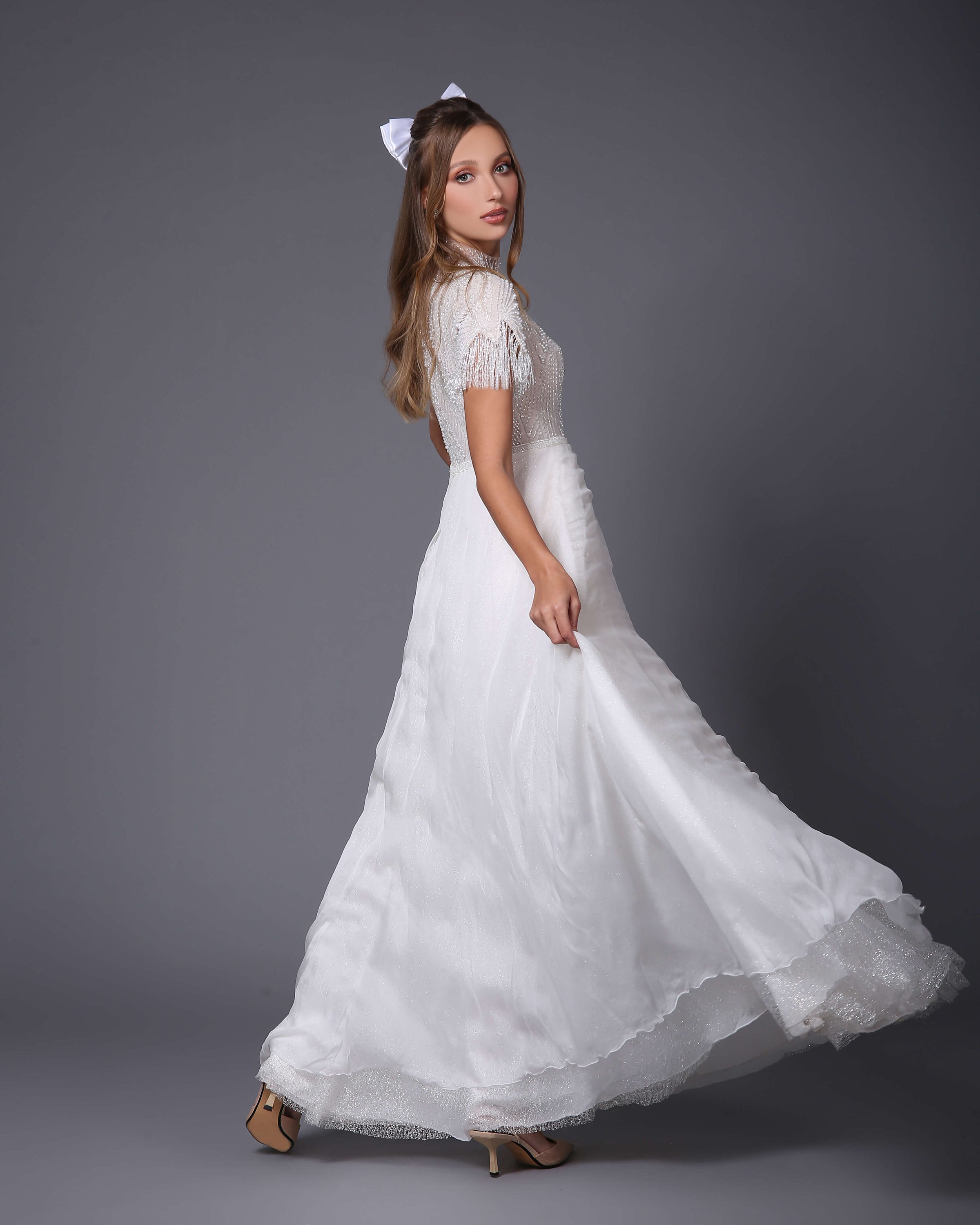 Materials: Beaded and pearl fabric, Silk tulle, chiffon, sparkle fabric