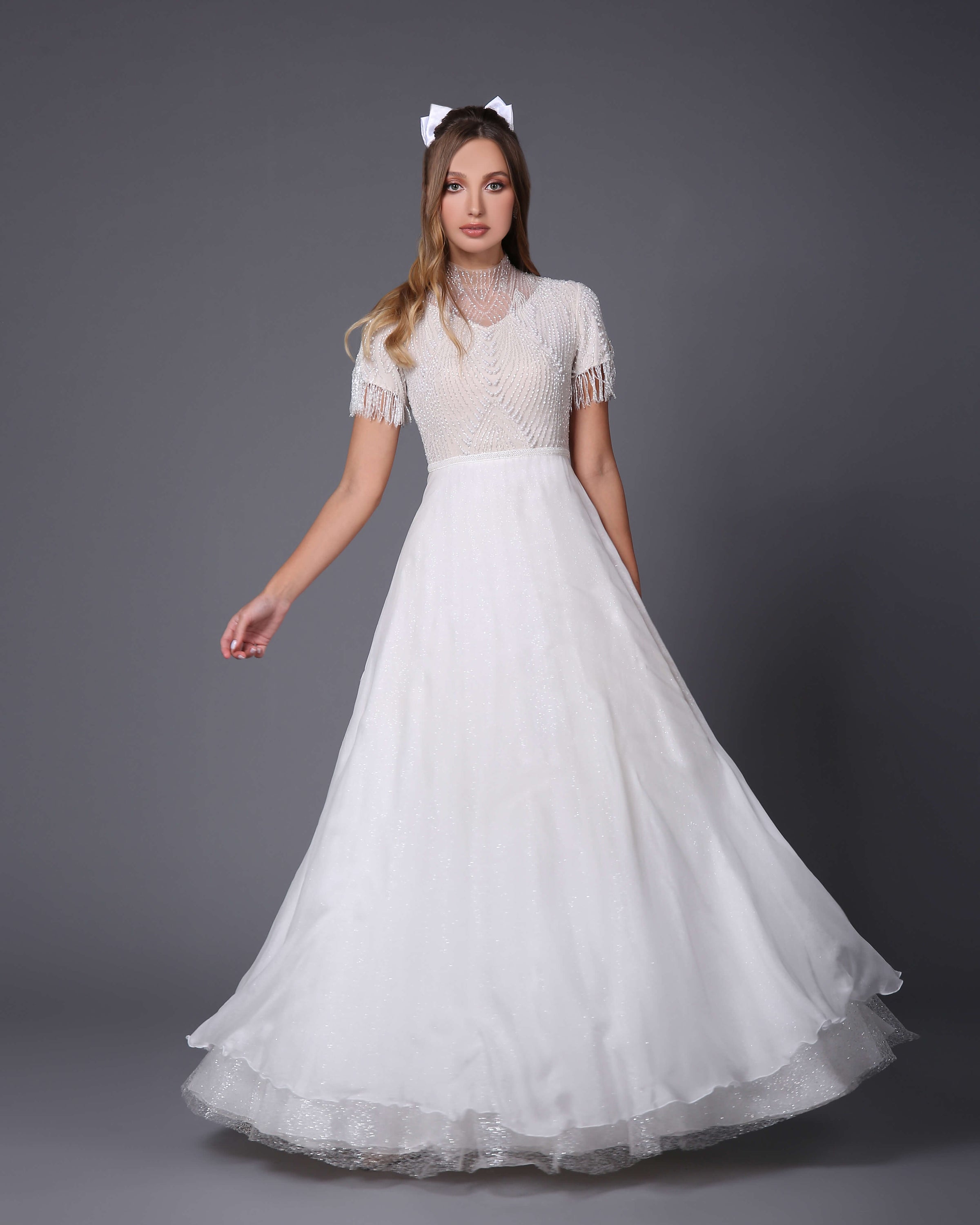 A-line dress with silk and sparkle skirt. French lace upper part of the dress with short sleeves and beaded fringes. V-neck front and back covered with sheer beaded and pearl fabric. The one-piece dress has a beaded belt and a lock along the entire back, there is also a small neckline. Cups are built in.
