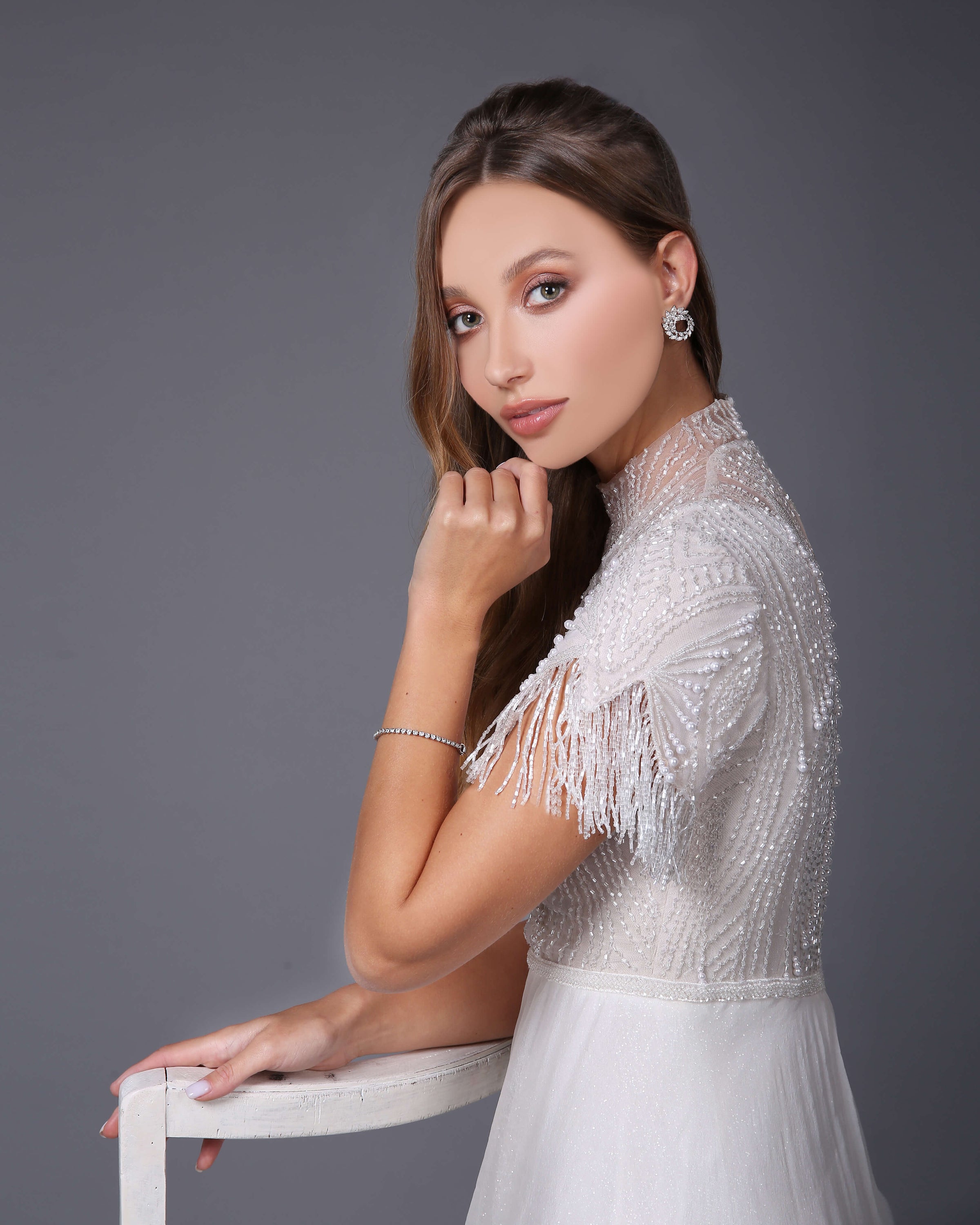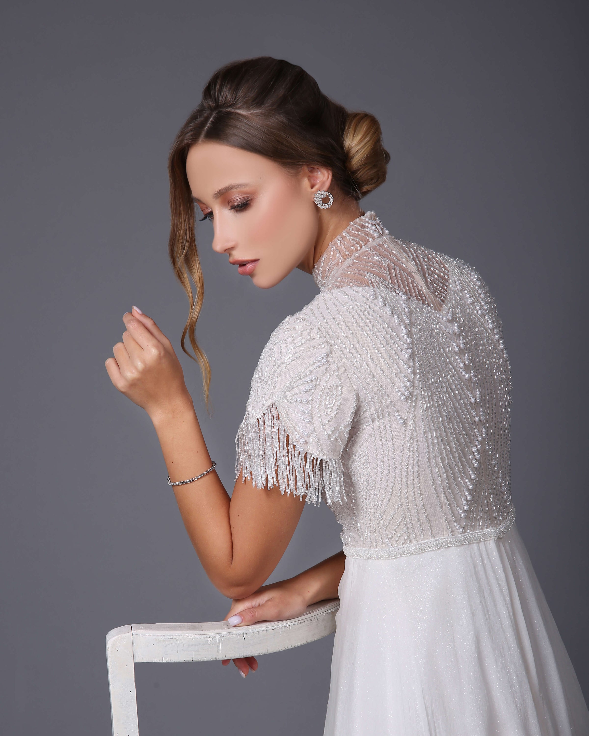 Decoration: Beaded and pearl fabric, Swarovski stones, beaded belt