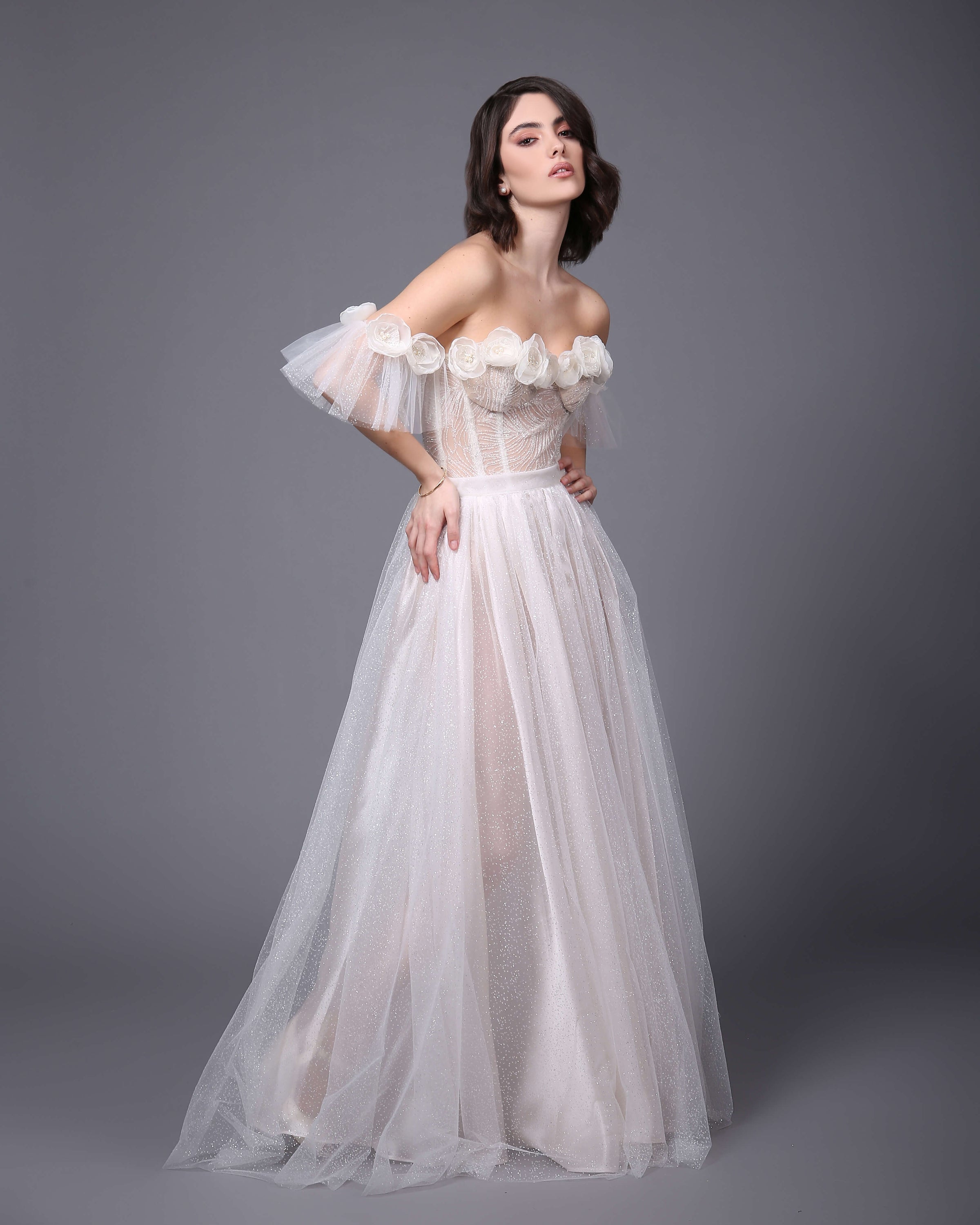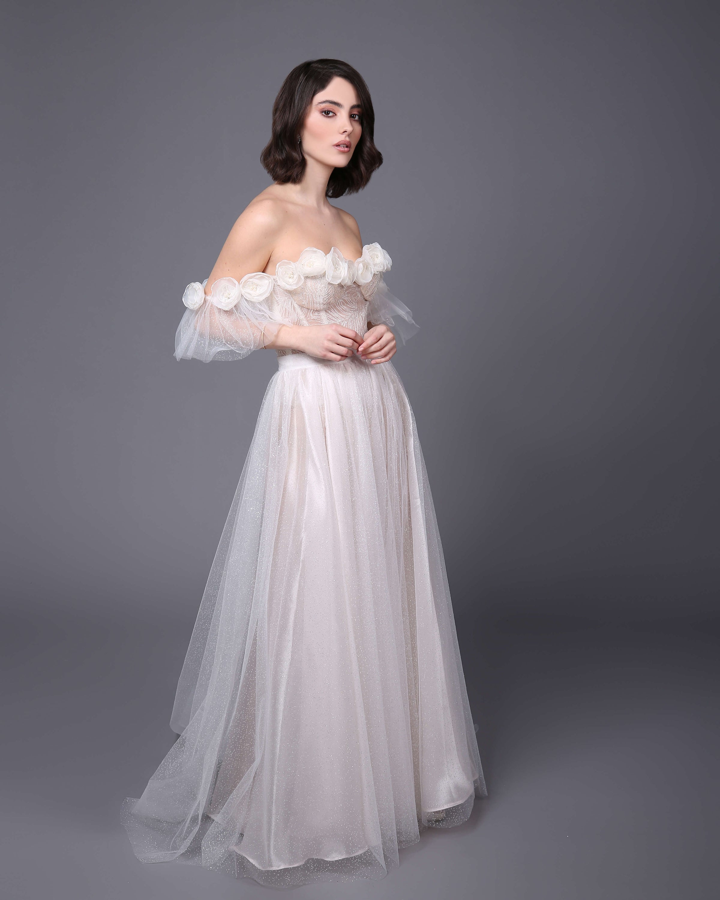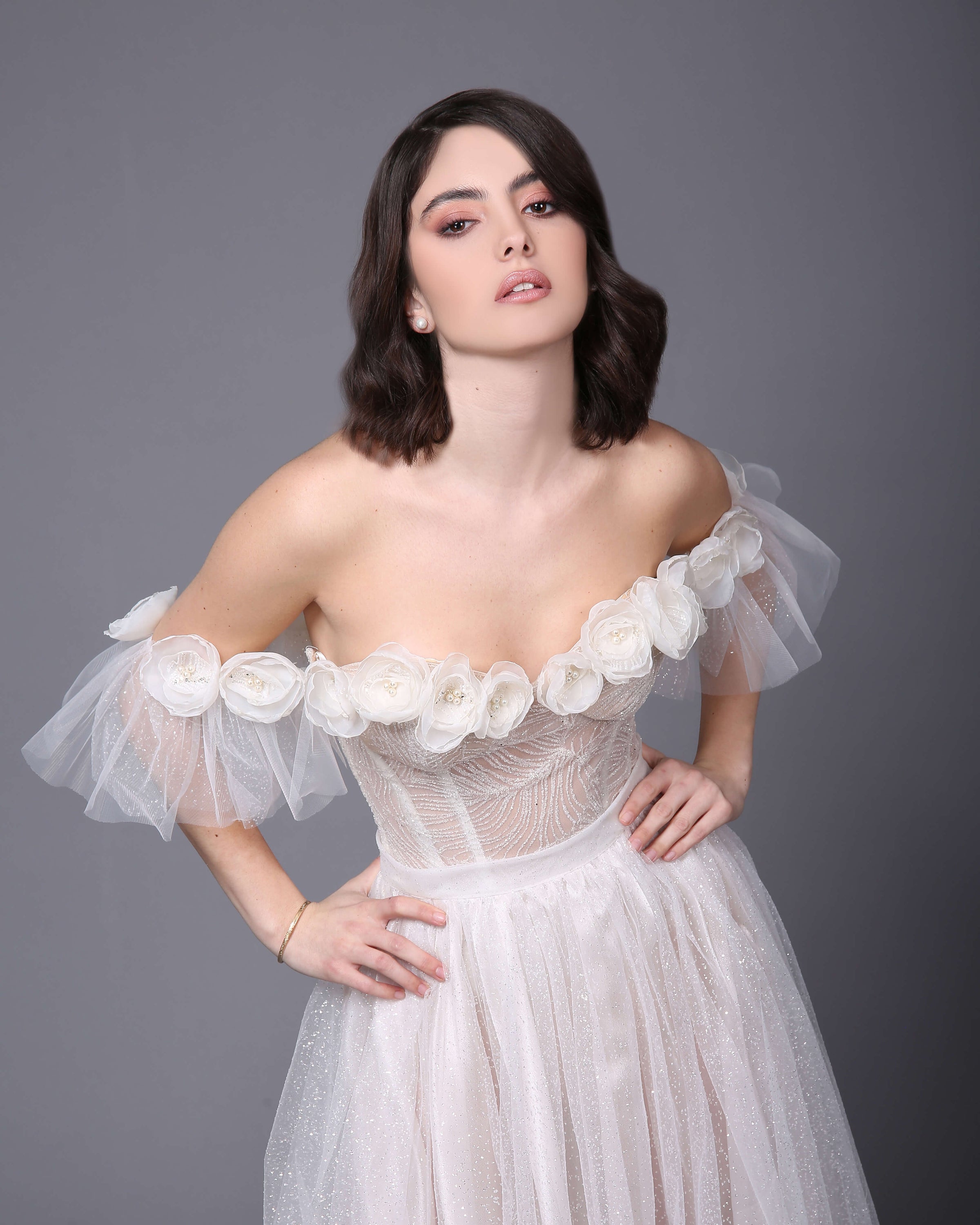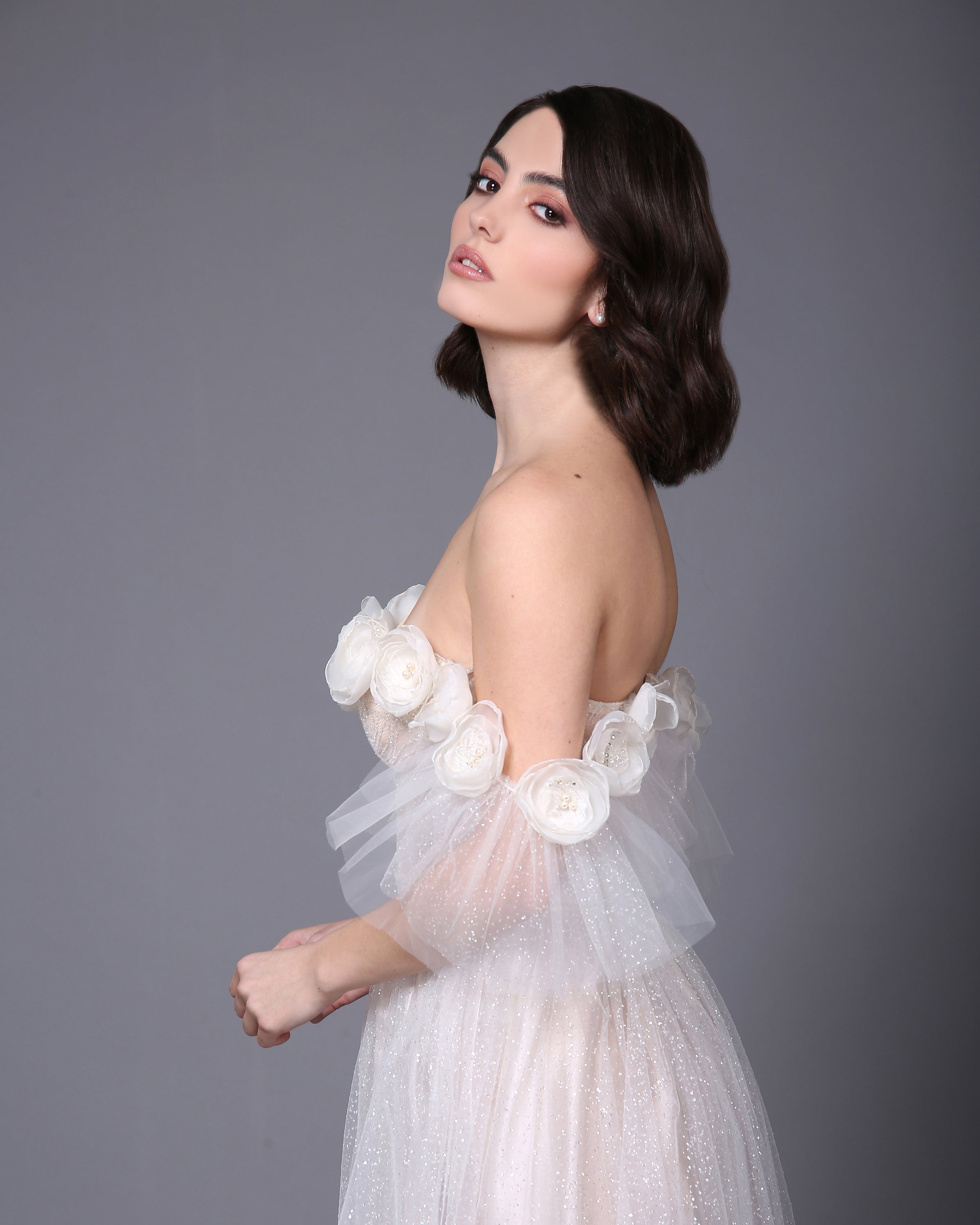 A-line dress with a tulle skirt and a small train. The bodice is based on sparkle fabric, and has detachable wing sleeves covered with handmade flowers and is also decorated with flowers along the entire chest. The corset is fastened with lacing on the back and is adjustable in size. The dress consists of two parts - a skirt with a fastener on the back and on the upper part of the bodice, which has chic hanging sleeves. Cups are built-in.