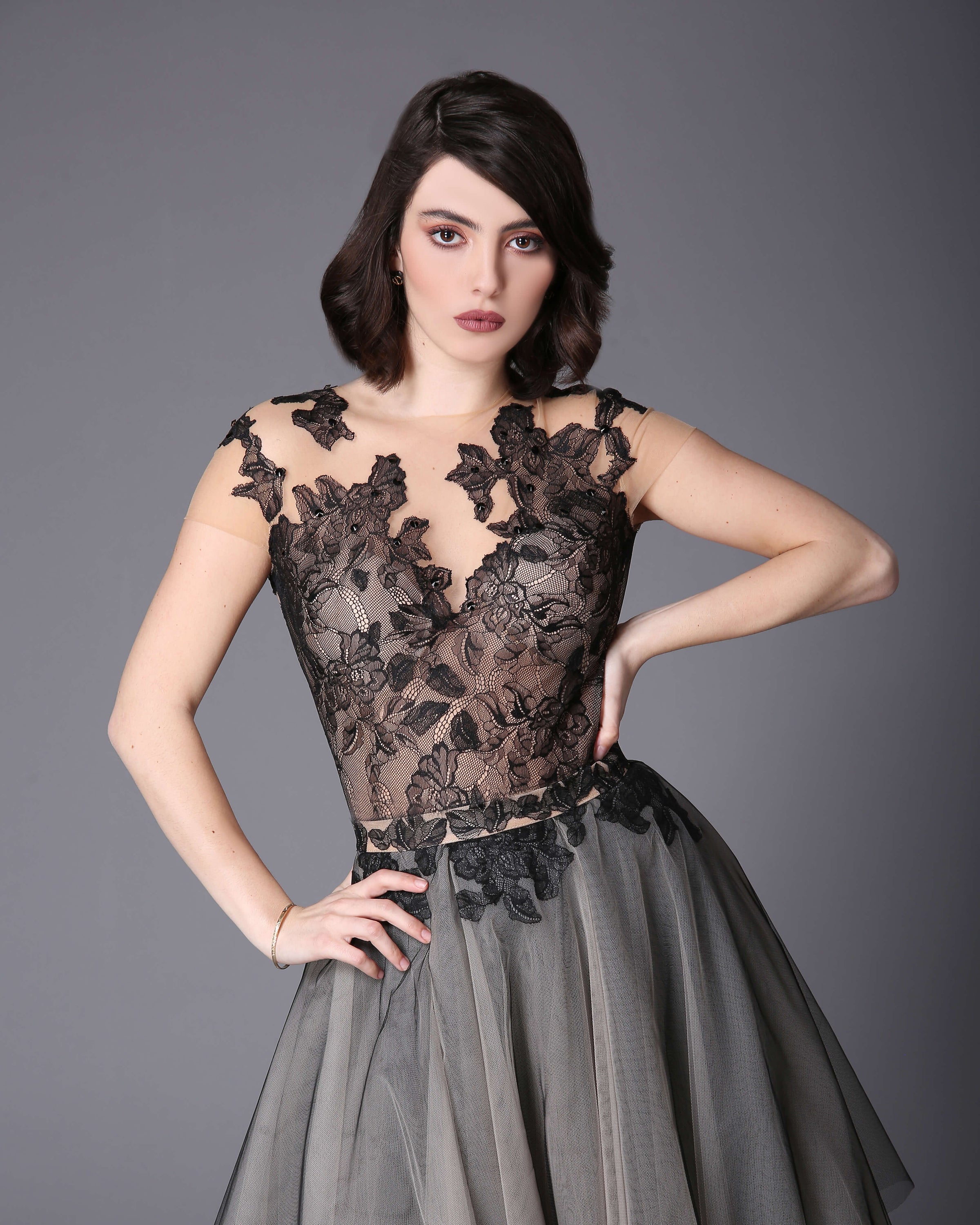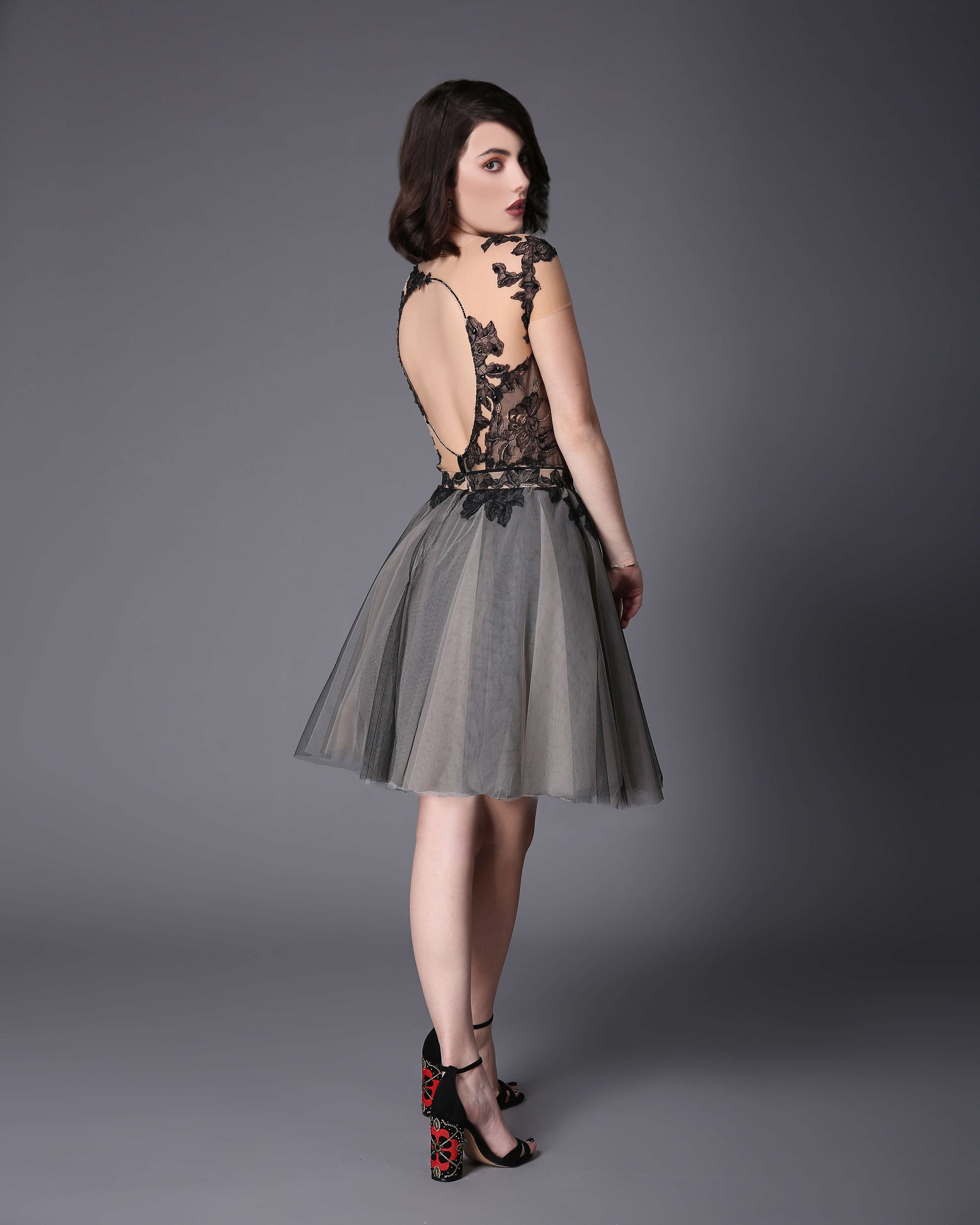Two-piece dress with short tulle skirt and bodysuit. the bodice with a transparent base is decorated with French lace and Swarovski stones with short sleeves and an open sexy back. Bodysuit with a zipper and hook on the back and a fastener on the panties. The skirt closes with a zipper and hook. Cups are built-in.