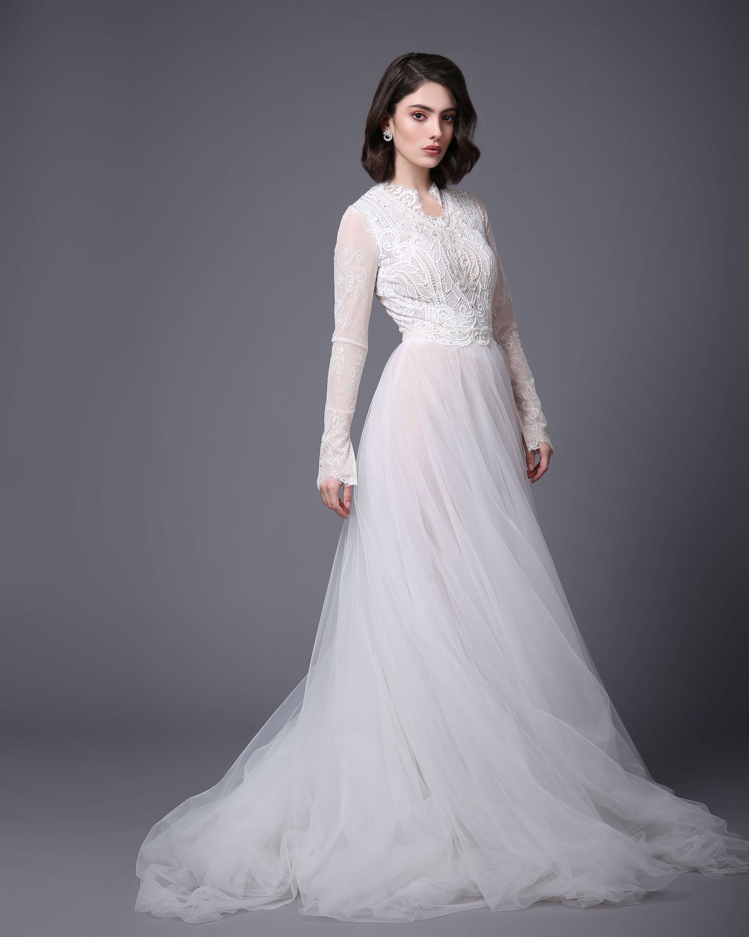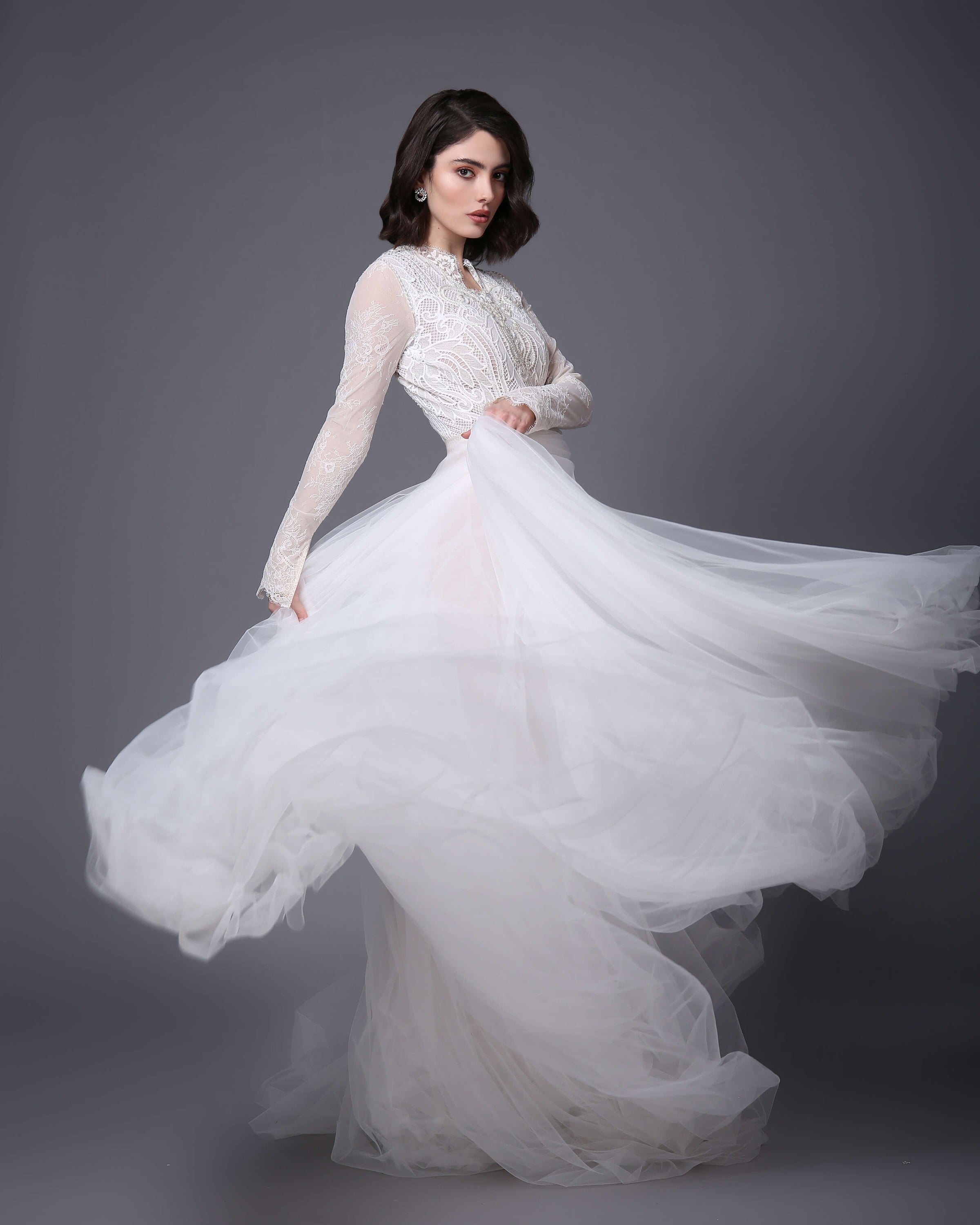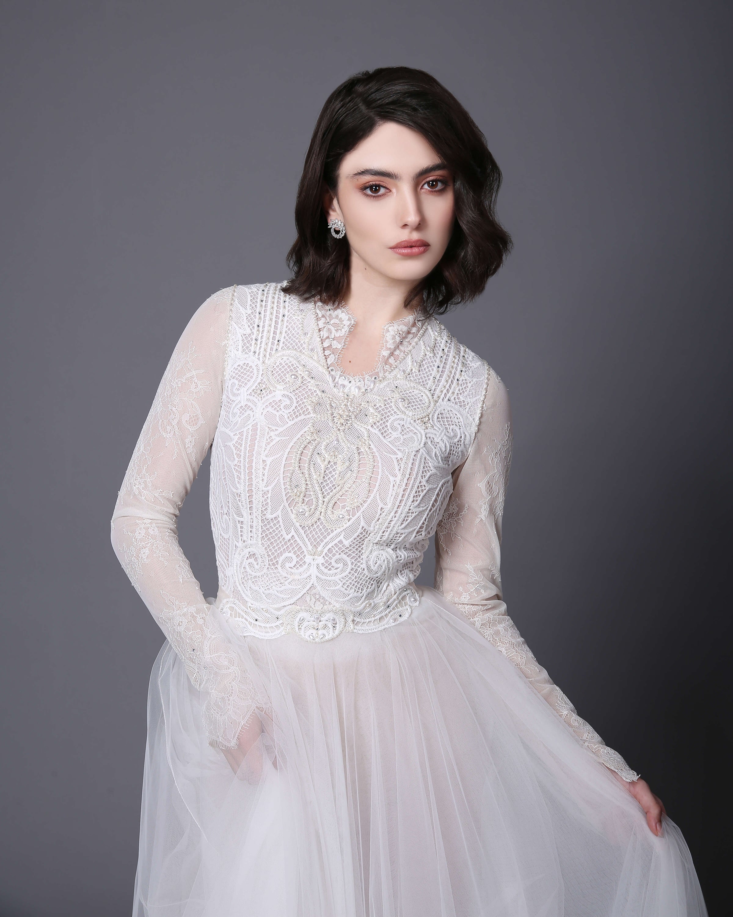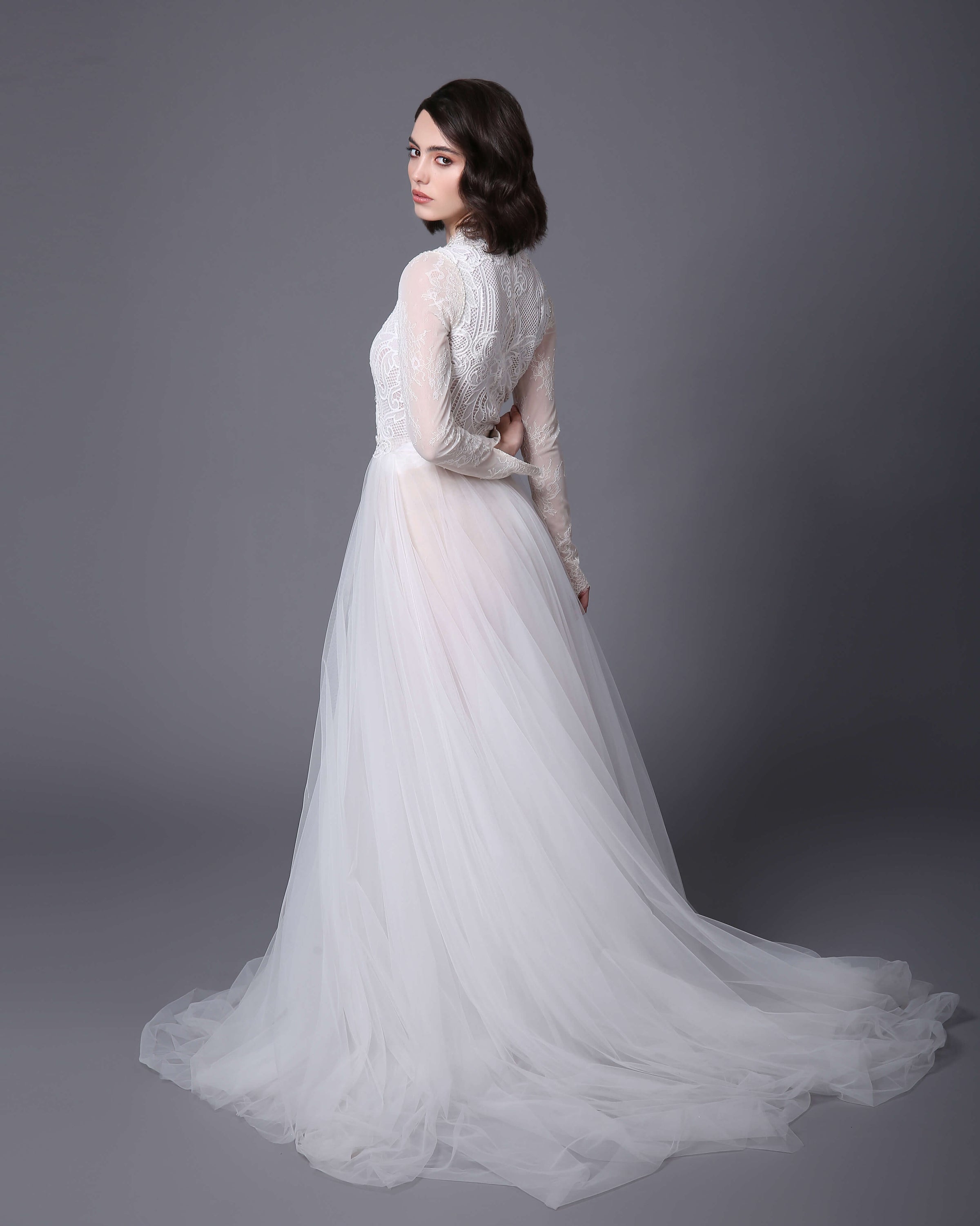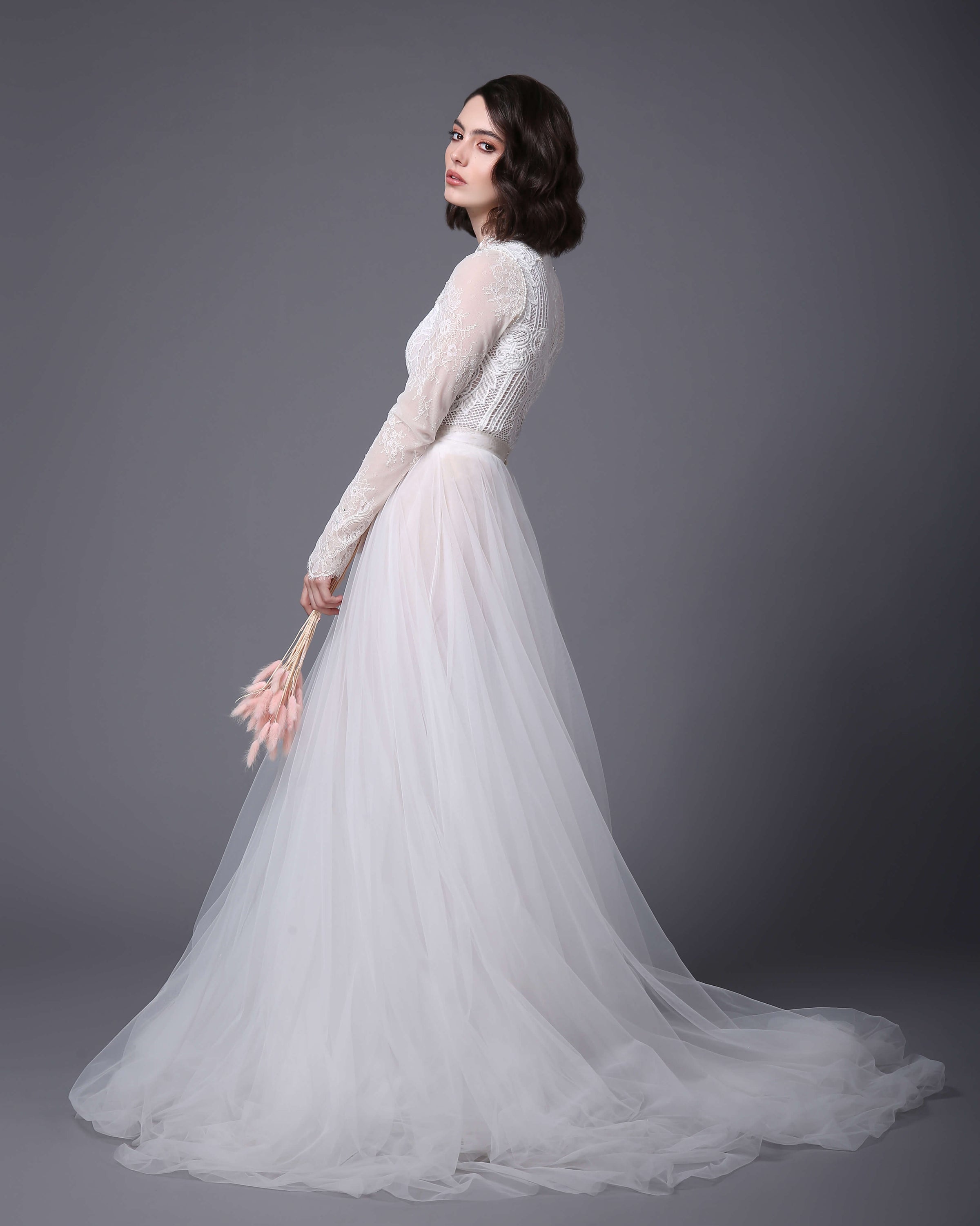 Two-piece dress with tulle skirt and long sleeve bodysuit. The upper part of the dress is made of French lace with a beautiful collar in the front. The back is closed. Skirt has back closure. Bodysuit closes from the back and has a fastener for panties. Built-in cups are available.